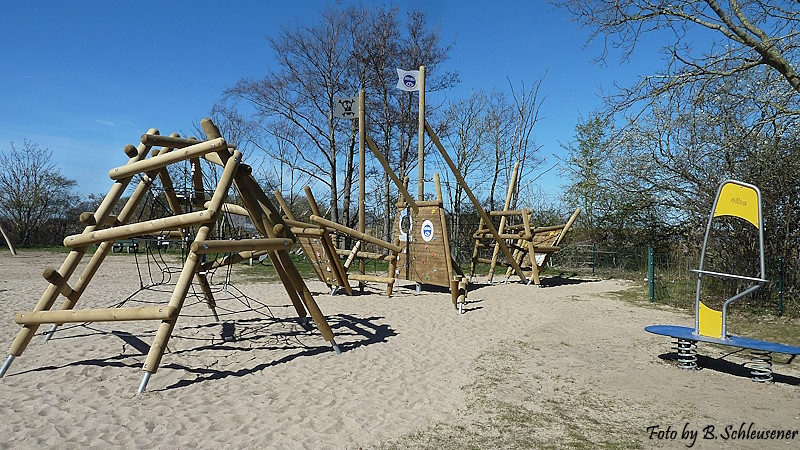 Bei dem größten Spielgerät handelt es sich um ein dreiteiliges Piratenschiff mit Kletterwand, Kletternetz und Trittseilen.