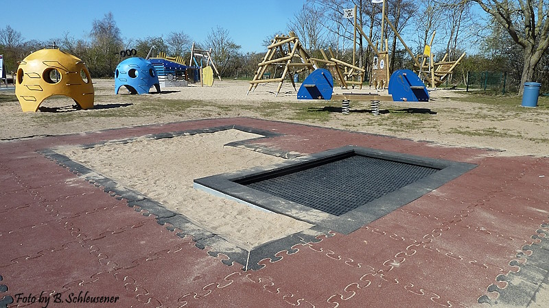 Die Umrandung des neuen Sandkastens ist mit Fallschutzmatten umgeben, genau wie die hier abgebildete Spielfläche mit Trampolin.