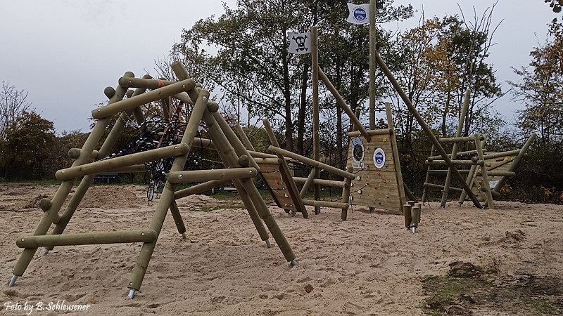 Bei dem größten Spielgerät handelt es sich um ein dreiteiliges Piratenschiff mit Kletterwand, Kletternetz und Trittseilen.