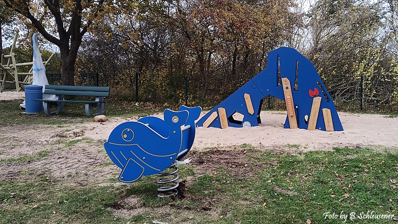 Im Vordergrund lädt ein auf Federn montierter Wal zum Wippen ein.