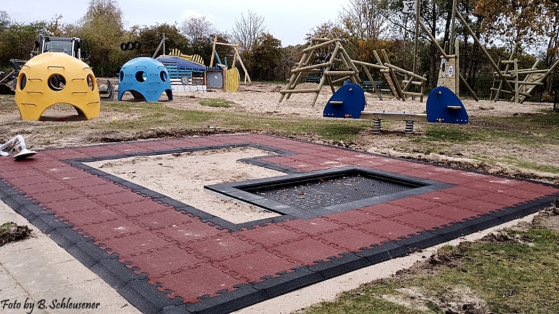Der neue Sandkasten ist mit Fallschutzmatten umgeben, genau wie die hier abgebildete Spielfläche mit Trampolin.